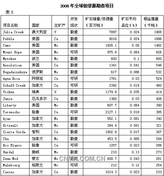 就2008年全球25个涉及钼资源的勘查项目来看,全球钼资源丰富,他们的钼金属量总计为1335.8万吨,平均品位0.033%。其中:有7的项目正在进行可行性研究,钼金属量合计275.9万吨;有18个项目正在进行勘查,钼金属量合计1059.9万吨。25个项目中有2个项目的主矿产比较特殊,一为澳大利亚的朱丽亚(Julia)矾矿床,另一位瑞典的维肯(Vicken)铀矿床。