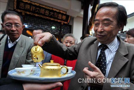 10月12日,中国工艺美术大师王殿祥在南京创办的“王殿祥金文化会馆”建成开放。馆内陈列的各种黄金工艺精品中,几只新打造的纯金茶壶引人注目。这些纯金茶壶造型各异,每只重100克左右,壶壁厚度仅0.25至0.3毫米,但有较强的韧性,可观赏也可使用。王殿祥以金银艺术品的设计制作而著称,是国家级非物质文化遗产金银细作工艺传承人。