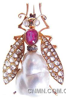 小虫造型胸针,受维多利亚时代关注自然的风气影响,制造于1880年,使用了珍珠和红宝石作为修饰。