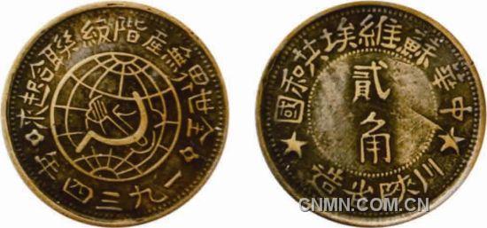 川陕省造贰角银币的青铜样币。面背图文清晰,珠圈规整细密,齿边。面文“苏维埃”三字大而彰显,背实心镰压空心锤,锤头布长短四斜线。币体外径23.3、厚1.5毫米,重4.6克。