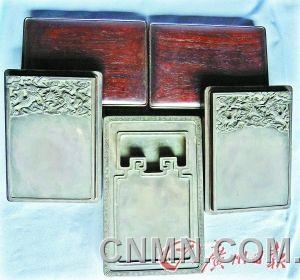 记者近日在何先生的藏室见到了这3方贡砚。两方清代“端溪贡品”端砚是图案对称的对砚,材质为名贵的老坑大西洞石,石品丰富,上雕精美的“双龙戏珠”图案,长15厘米,宽10.5厘米,高2厘米。对砚各装在一个紫檀木盒里,再放入一个外面刻有“端溪贡品”的双层金丝楠木盒中,原汁原味,古色古香。