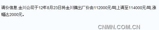 2012年08月23日 11:25 1472次浏览 来源: 中国有色网 分类: 金川公司镍报价