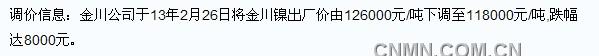 2013年02月26日 11:10 1533次浏览 来源: 中国有色网 分类: 金川公司镍报价