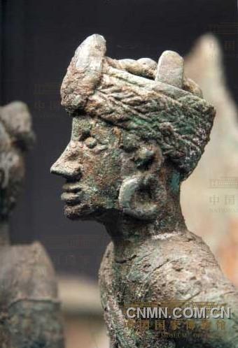 在铜贮贝器的盖面上多铸有表现集体场面的群像。在云南晋宁石寨山出土了大量别具一格的铜贮贝器,其中一件 杀人祭柱(或鼓) 的贮贝器,在直径不到35厘米的器盖上,焊铸各种人物多达120余躯。整个构图以 干阑 式建筑物平台上的活动为中心。台上坐一体型高大通身鎏金的人物,其旁列坐群僚。平台前置鼎镬等作 刑牲屠马,杀猪宰羊 之状,旁有猛虎、孔雀等。平台后置铜鼓和一柱一碑,柱上铸有盘蛇,碑上缚一裸体男子,平台四周还活动着男男女女各色人物。这个场面的含义,有人推测是滇王与其他部族首领盟誓的仪式。与之类似的一件贮贝器,盖上有41个铜人,也是表现杀人祭祀铜柱的场面。一件鼓形的飞鸟四足贮贝器上表现了纺织场面,其盖上铸有18个小铜人,表现一女性奴隶主监督一群女奴隶用原始的 腰机 艰苦织布的场面。女奴隶主抚膝安坐,闭目养神,旁有奴隶侍候。女奴隶主身材高大,身上鎏金,表现出社会地位的尊贵。另外还有验收保管布匹的人物,非常生动地展现了2000多年前滇族社会中奴隶制纺织手工业的实况。在两件表现战争的贮贝器上,一件表现为敌方士卒向滇人指挥官和士兵跪地投降,为受降场面。另一件则是一群滇人健卒在捕杀、践踏少数敌方士卒,借此夸耀本部族作为战胜者的荣耀和光荣,实际上暴露了滇人奴隶制社会的落后性和野蛮性的一面。还有一件贮贝器的盖上铸造了一组纳贡人物像,塑造了17个异族人物,他们头顶箩筐、牵着牛马,携着货物来进贡,构成了一幅滇王室统治和支配其他弱小民族的图景,其优点在于多角度地表示了纳贡人物之多的场面,给人以络绎不绝的印象。每个人物着以不同的民族服饰,穿插以牛、马等动物,使得这组雕塑组群起伏跌宕,丰富多彩。