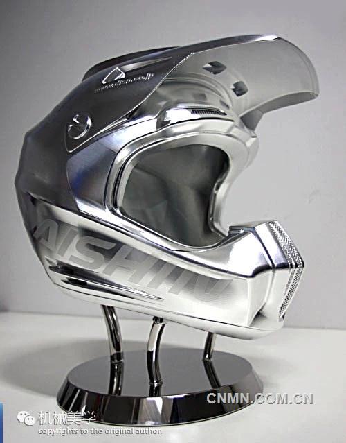 加工过程中,机床灵活地四处移动袁不断切削旋转的铝块,很快就清楚地呈现出了经过精细造型的头盔形状。