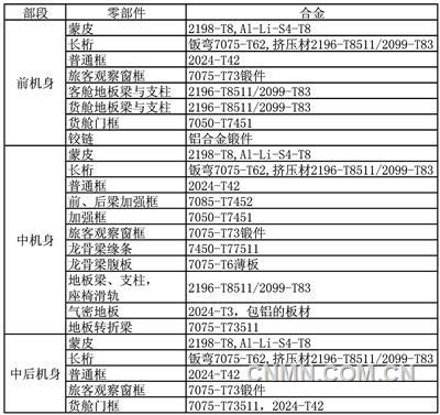 在选用铝材上,既选用了大量的传统铝合金,如7075-T62、7075-T73、7050-T7451、7050-T73511、7050-T77511、7050-T7351、7050-T7452、7150-T77511、7075-T6、7055-T7751、7055-T76511、7085-T7651、7085-T7452,2024-T42、2524-T3、2024-T3511、2054HDT-T351、2026-T3511等;还选用了一定数量的第三代铝-锂合金:2198-T8、Al-Li-S4-T8、2096-T8511、2099-T83等,但是7xxx系合金用得最多。