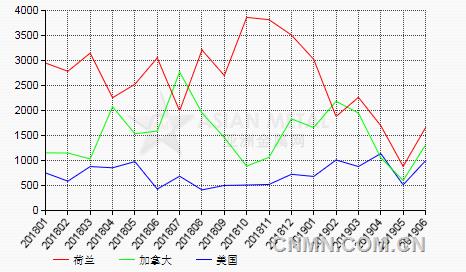 6月份中国镁合金前三大出口目的国分别是荷兰、加拿大和美国。其中出口至荷兰镁合金为1,656吨,环比增加87.8%;出口至加拿大镁合金为1,310吨,环比增加118%;出口至美国镁合金为994吨,环比增加93.8%。
