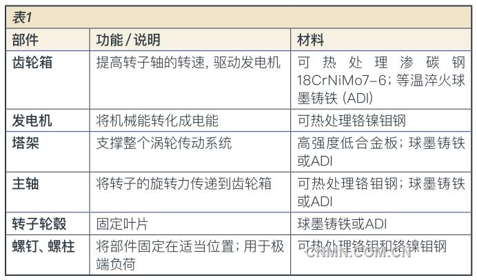 目前,公用事业规模的风力发电机总输出功率已超过5兆瓦(MW)。按每兆瓦材料用量计算,风力发电是所有发电方式中钢铁密集程度最高的。按现有设计方案计算,每兆瓦装机容量大约要用300吨钢材。表1列出了风力发电系统的一些主要部件、典型结构材料及其用途。表中很多部件采用了含镍材料。