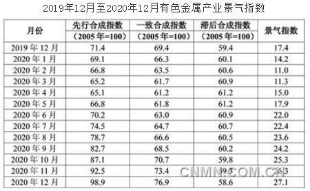 2020年12月,中国有色金属产业景气指数为27.1,较上月回升0.8个百分点;先行指数98.9,较上月回升6.4个点;一致指数为76.9,较上月回升3.5个点。数据显示,产业景气指数继续在“正常”区间运行。