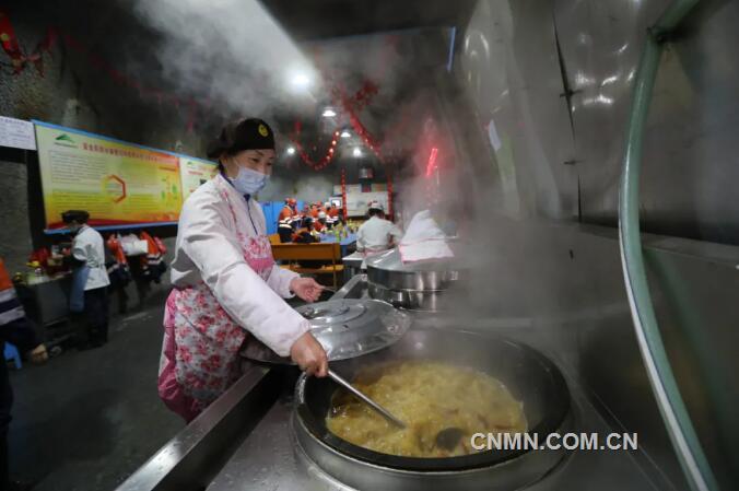 2月11日,在金川集团三矿区采矿二工区井下食堂,后勤服务人员为工人们准备年夜饭。