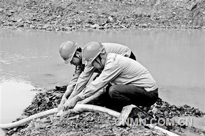 图为该区域事业部项目部值守员工正在奋力包扎、紧固排水软管。