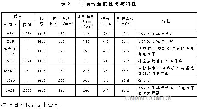 锂离子电池用铝箔有两种:平箔,拥有高的强度、高的电导率与平平坦坦;表面改性箔。日本联合铝业公司研发的平箔有7种:A85、C2F、高强度C2F、FS115、MS812、X383、503S,其中A85、C2F、503S是通用工业箔,可应用于民用各个领域,C2F、MS812、X383合金有高的强度与电导率,F5115合金在涂漆烘烤后有高延展性;表面改性箔(ASP,Advanced Surface Profile)有高的强度、高的电导率与表面粗糙化,由于表面粗糙化,活性物质附着性大有提高,同时可以减少粘接剂用量,电池特性也得以改善,采用新的粗化工艺,比传统工艺的生产成本有所下降。平箔合金的性能见表8。