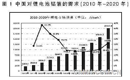 由于全球新能源车辆的高速发展,对锂电池的需求旺盛,拉动电池铝箔需求的快速上升,在2010年~2030年期间,没有哪种铝产品的产量增长速度可与电池铝箔试比高。根据樊玉庆的资料(《上海铝业》2016年第6期p.16-27:锂电池集流体用铝箔的技术进展及市场前景)(有关数据见表11及图1),2015年-2025年,锂电池铝箔产量的复合增长率可能达25%,如以2015年的产量3万吨为基数,那么2025年的产量可能突破28万吨,这是非常惊人的数字。1GWh锂电池的铝箔约750吨。中国是锂(离子)电池生产大国,2017年中国锂电池箔的消费量4.5万吨,约占全世界总消费量的58%。