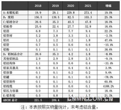 根据我国海关数据统计,2021年,我国铝及其制品(海关税则第76章)进口量总计达428.3万吨,同比增长15.3%;进口总额达125亿美元,同比增长53.6%。其中,铝及铝合金进口量达273.4万吨,废铝进口量达103.3万吨,均有较大增长。另外,2021年我国铝车轮进口量达1.7万吨,同比增长21.4%;进口额达1.3亿美元,同比增长38.6%。