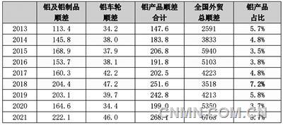 综合计算,2021年,我国铝产品贸易顺差268.2亿美元(不含铝土矿和氧化铝),增长34.8%。此前最高顺差额为251.6亿美元(2018年)。2021年,我国对外贸易总顺差额为6763.4亿美元,其中,铝产品贸易顺差占比为3.72%。若考虑铝土矿和氧化铝则贸易逆差额为62亿美元,我国铝产业链的贸易顺差额为206亿美元,占全国外贸总顺差额的3.1%。