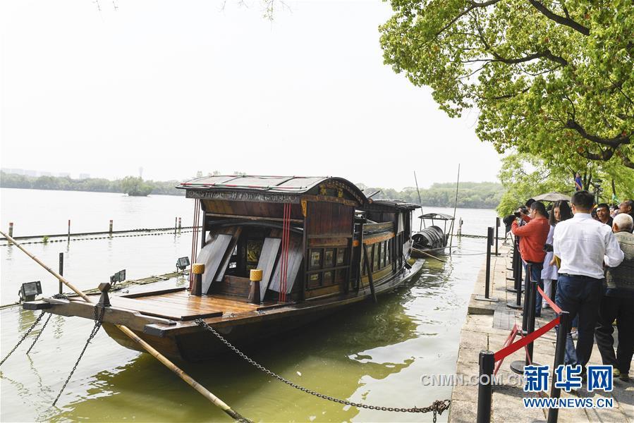 游人在浙江嘉兴南湖“红船”边参观(2018年4月11日摄)。新华社记者 黄宗治 摄