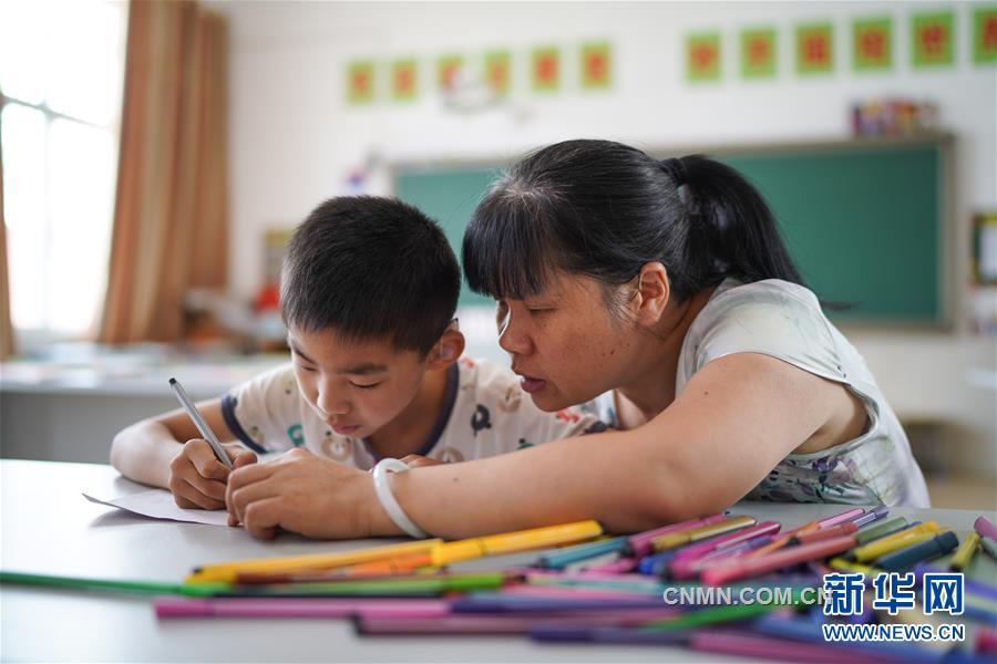 江西萍乡芦溪县特殊教育学校校长刘小清(右)在辅导一名聋哑学生画画(7月3日摄)。新华社记者 周密 摄