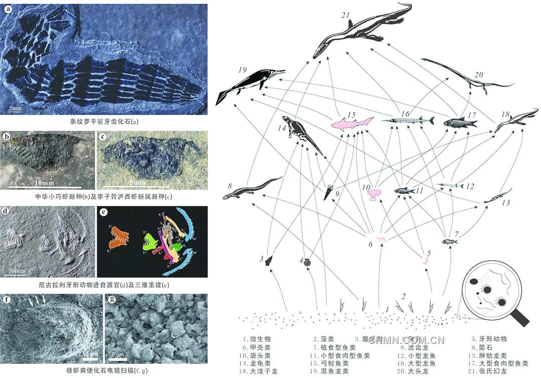 2.在中三叠世罗平生物群中发现处于关键生态位的食壳型条纹罗平鲨,并从牙形动物、袋头类节肢动物和粪便化石的角度补充了初级生产者与消费者的关系,精细刻画了罗平生物群复杂的食物网,揭示现代型海洋浮游生态系统在中三叠世安尼期已经出现。