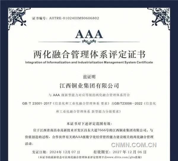 江铜集团获得工业和信息化部提出的“两化”融合管理体系标准AAA级贯标认证,为我国目前“两化”融合管理体系开放申请的最高评定等级。