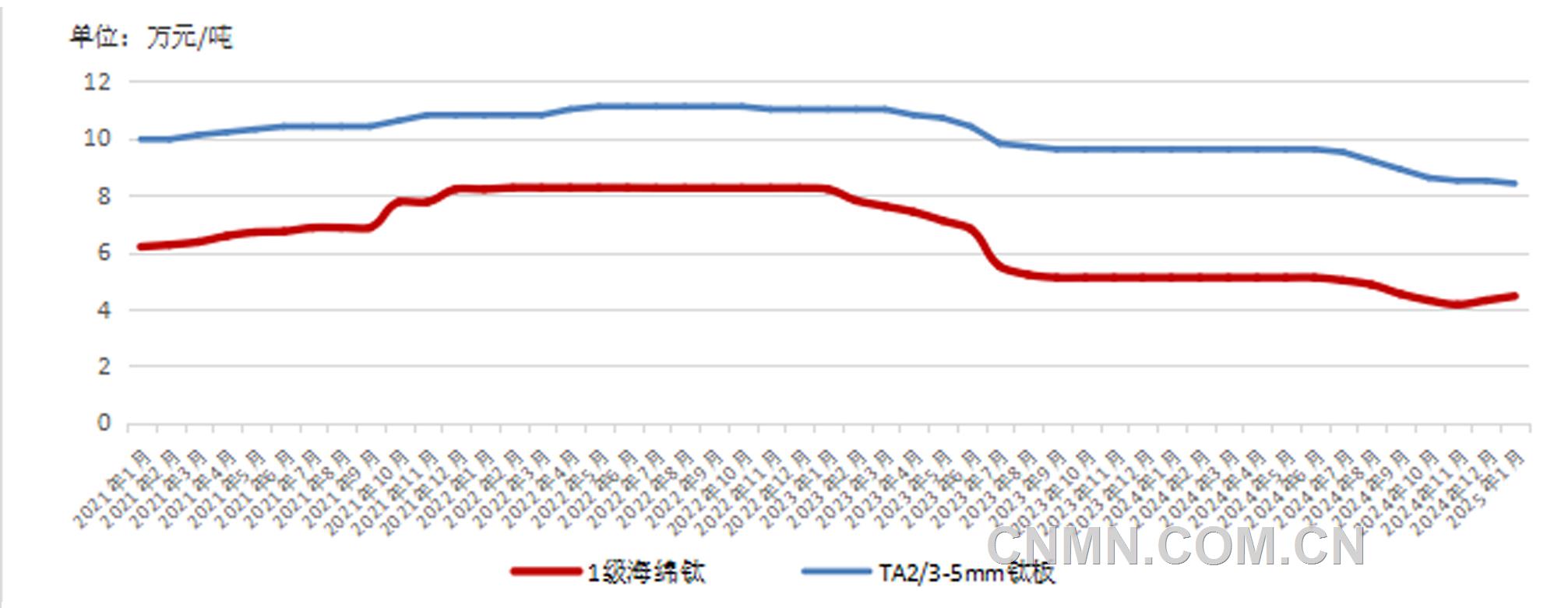 2021年—2025年1月国内海绵钛/钛板价格走势图