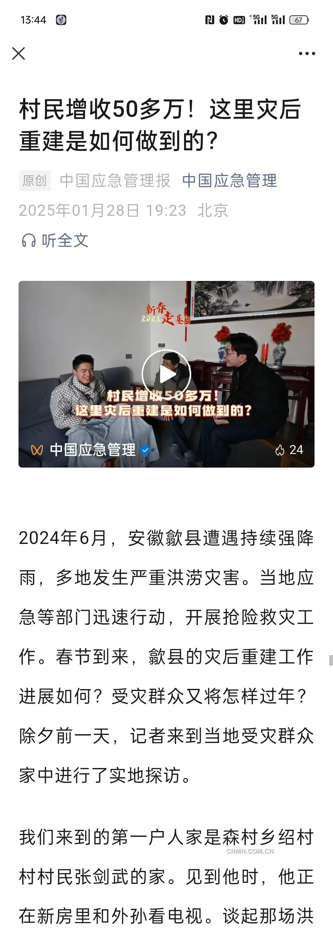 2025年1月16日,中国应急管理报一版刊发的一篇新春走基层稿件,讲述了记者在广东省梅州市蕉岭县蕉城镇,见证广州市支持的梅州市灾后重建的安居工程取得重大进展,受灾群众“美好生活从此启航”的故事。